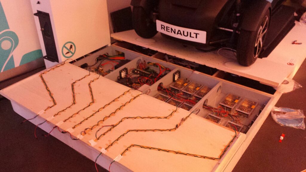 - Scénographie dynamique : Pilotage des lumières d’origine de la Twizy et synchronisation avec les mouvements des vérins mécaniques pour simuler une réaction « vivante » du véhicule lors de la charge.