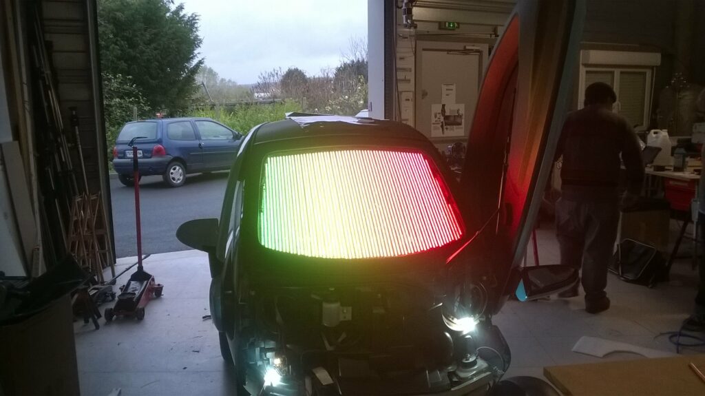 - Affichage LED (Pare-brise) : Conception d’une matrice sur mesure à l’aide de rubans LED WS2812 (Pixel adressable) fixés côte à côte pour créer un écran basse résolution capable d’afficher les expressions du véhicule.