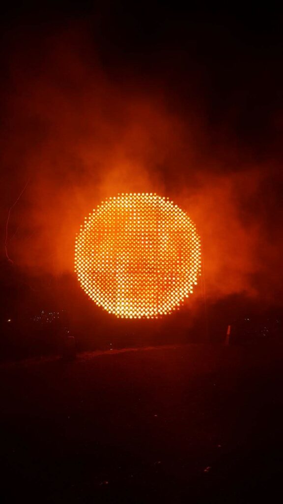 - Le Soleil Pixel : Pour obtenir ce rendu orange fixe et intense, j’ai utilisé un contrôleur Chromateq autonome, programmé pour maintenir une colorimétrie parfaite sans nécessiter de gestion logicielle complexe en temps réel.