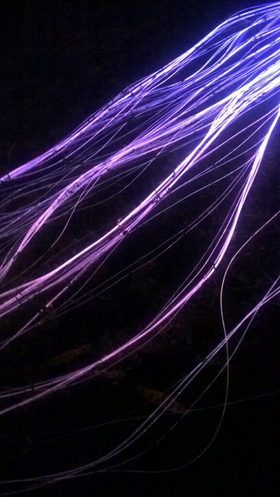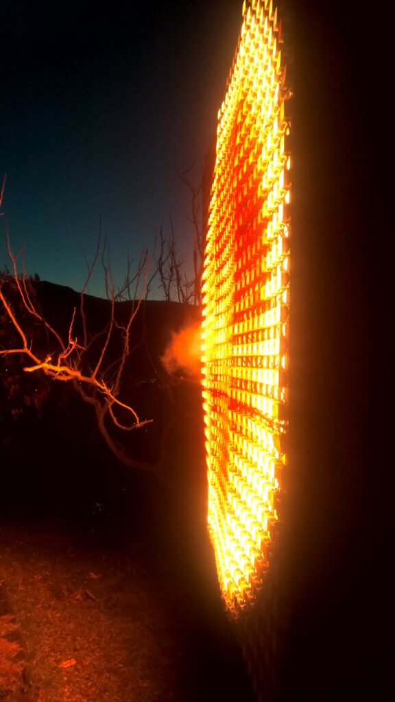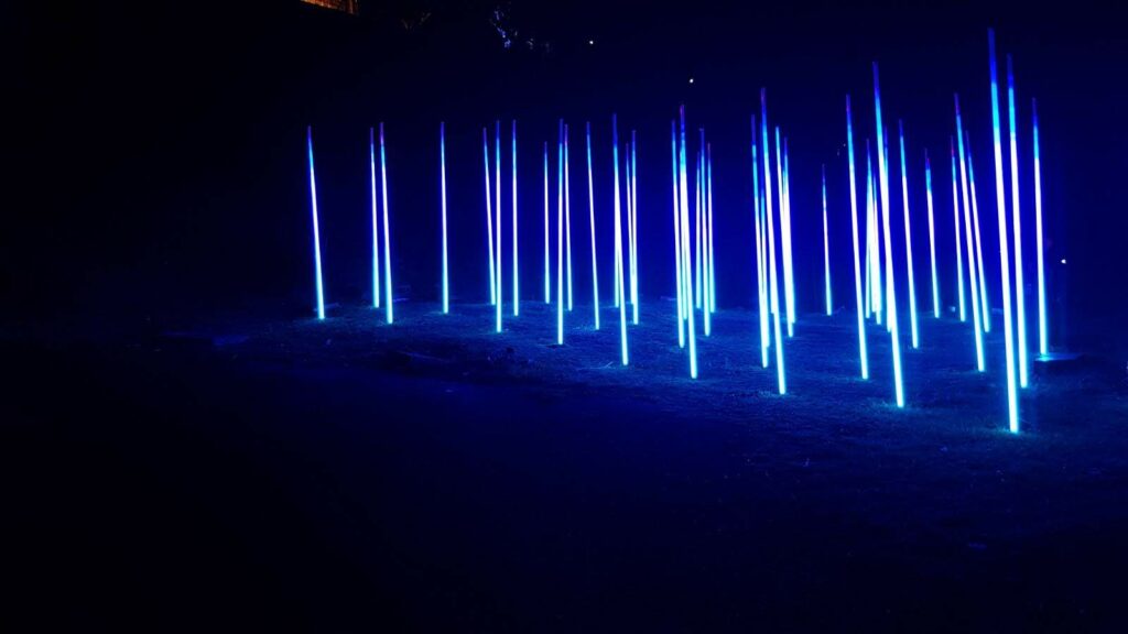 - Le Champ de barres LED : Pièce maîtresse de l’installation, ce champ utilisait des rubans LED WS2812 (pixels adressables). Le pilotage était assuré par le logiciel Resolume, diffusant une animation vidéo fluide jouée en boucle, traduite en signal pixel via des boîtiers de conversion.