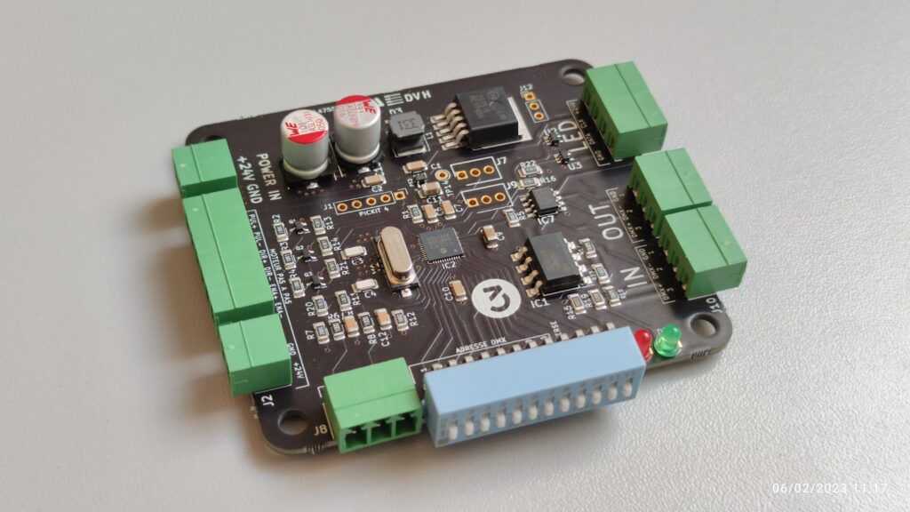 - Développement Électronique : Conception d’une carte électronique propriétaire permettant de piloter simultanément des moteurs de positionnement (moteurs pas à pas) et des pixels LED adressables via le protocole DMX.
